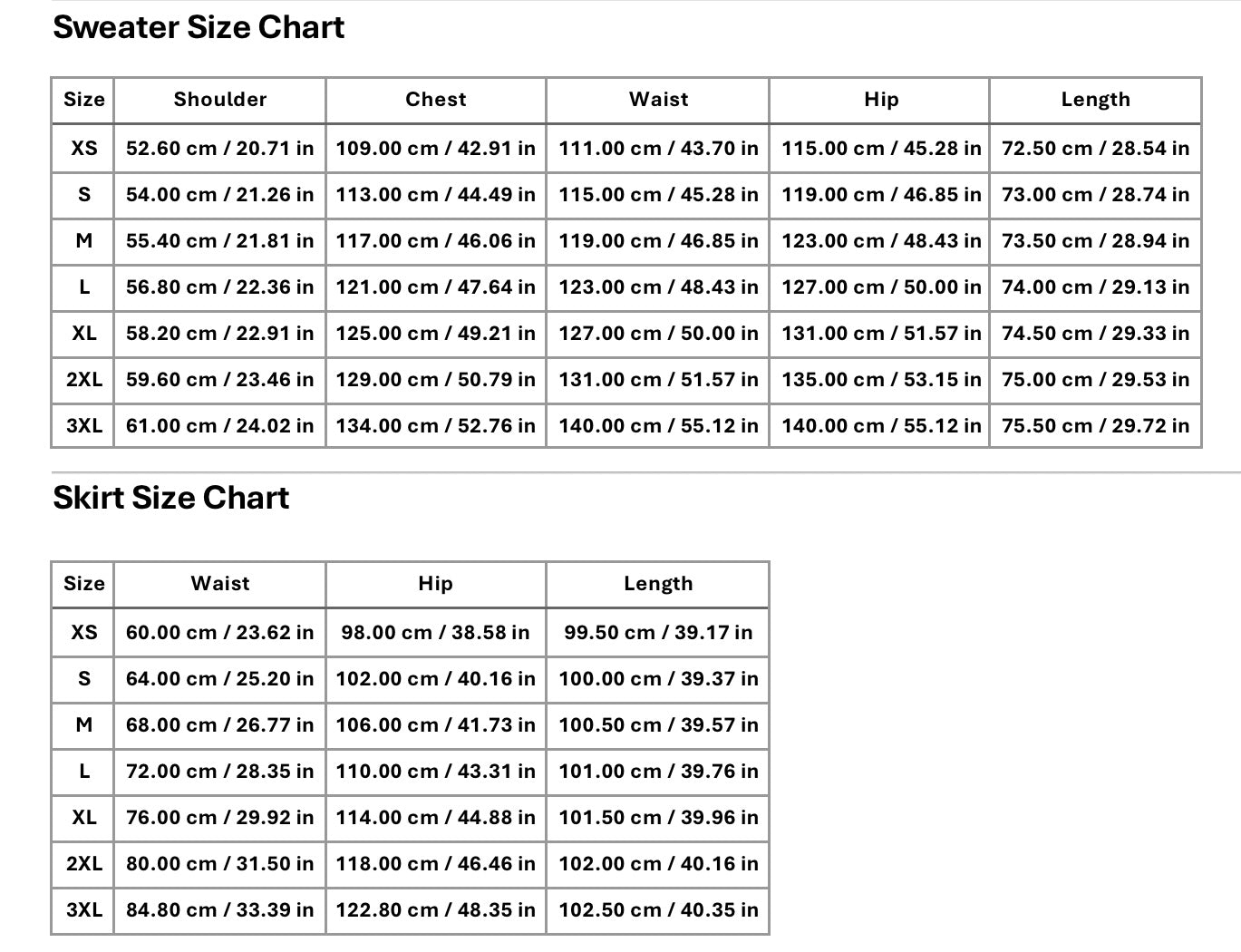Skirt Size Chart
