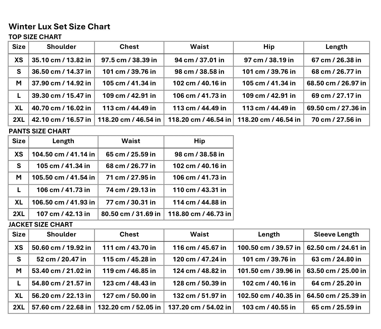 Winter Lux Set Size Chart